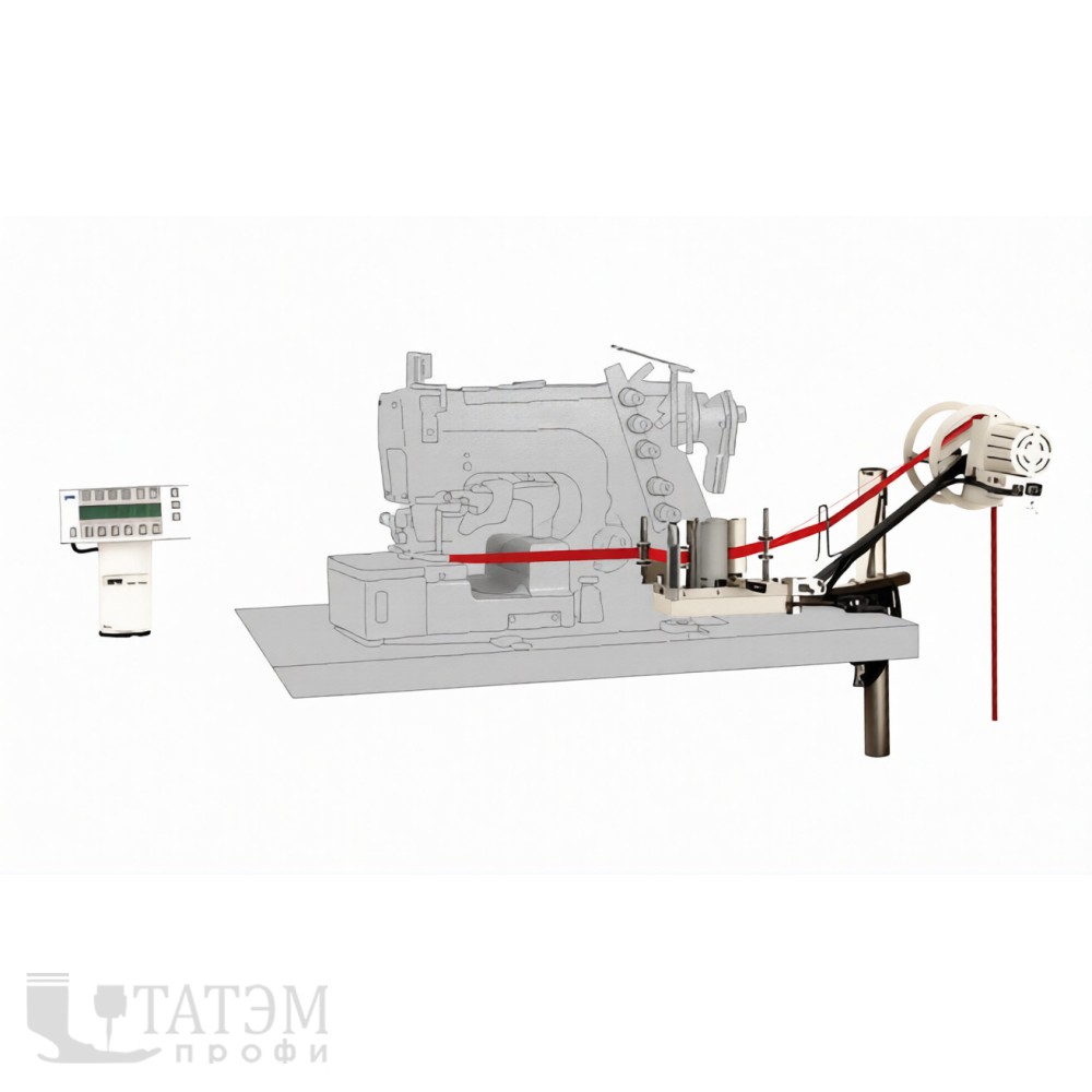 Программируемое устройство подачи эластичной тесьмы сбоку компактного типа. Универсальное, монтируется на стол. Программируется по 8 участкам.