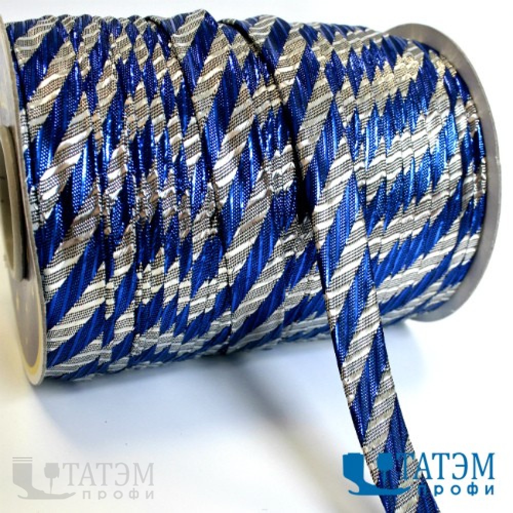 Бейка декоративная люрекс 15 мм "косая полоса" серебро/синий, уп. 100 ярд