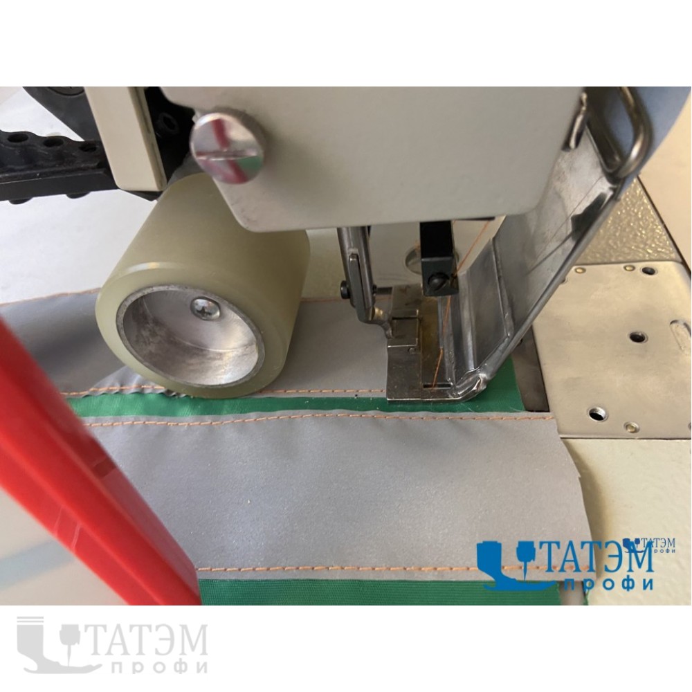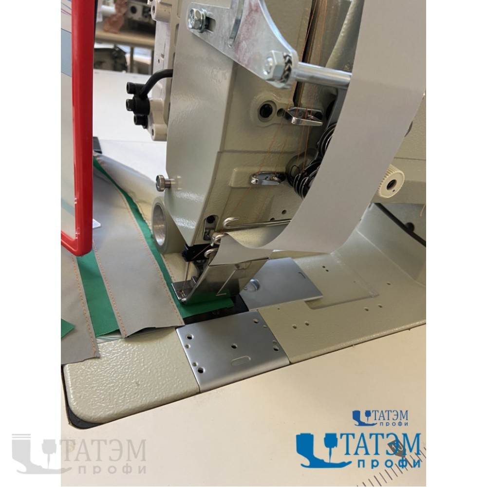 Двухигольная машина челночного стежка с пуллером для настрачивания светоотражающих лент без отключения игл.
