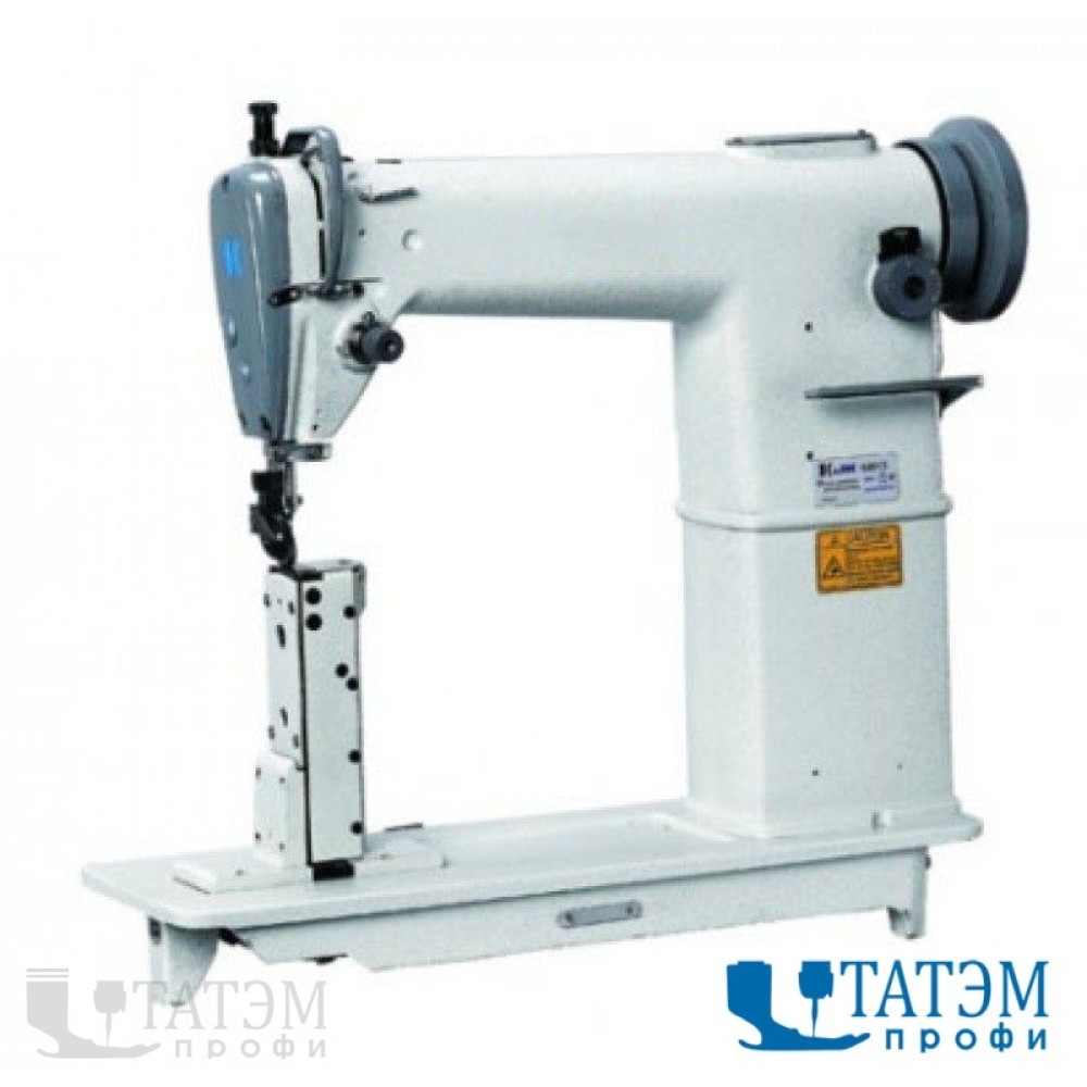 Одноигольная машина с колонковой платформой и устройством подачи тесьмы, для пришивания налобной ленты, при пошиве головных уборов из средних материалов и кожи.