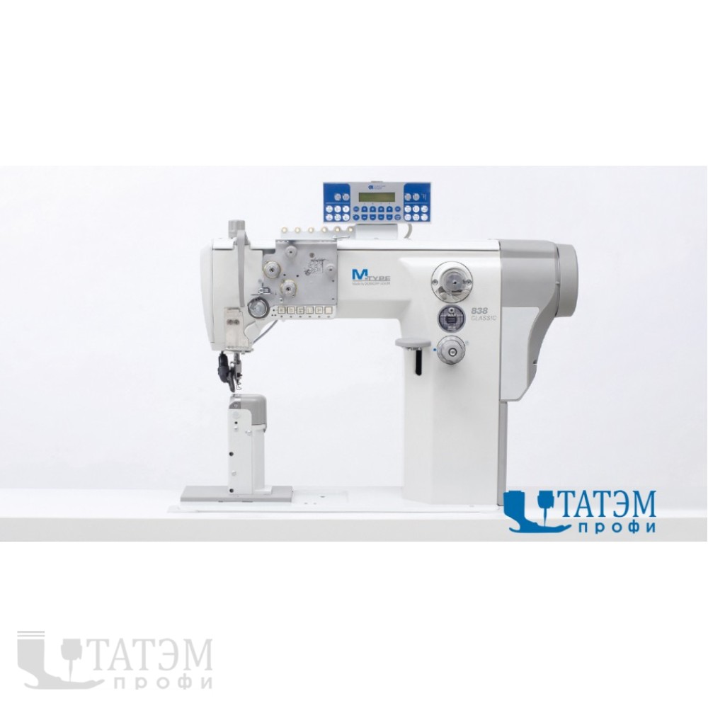 DA 838-270122-M - Двухигольная колонковая машина челночного стежка с приводной верхней роликовой лапкой и нижним реечным транспортером, с интегрированным в головку прямым приводом, с блоком управления DAC Сlassic и панелью управления DAC OP1000, с электромагнитным устройством обрезки нити, электропневматической закрепкой шва и подъемом прижимной лапки, с большим вертикальным челноком, предохранительной муфтой, высота подъёма прижимной лапки 12 мм, длина стежка до 8 мм, максимальная скорость 2.000 ст. / мин.