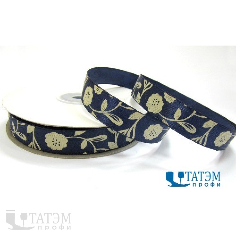 Лента декор. атласная с рис."цветы золотистые" 15 мм, синий, уп. 50 ярд