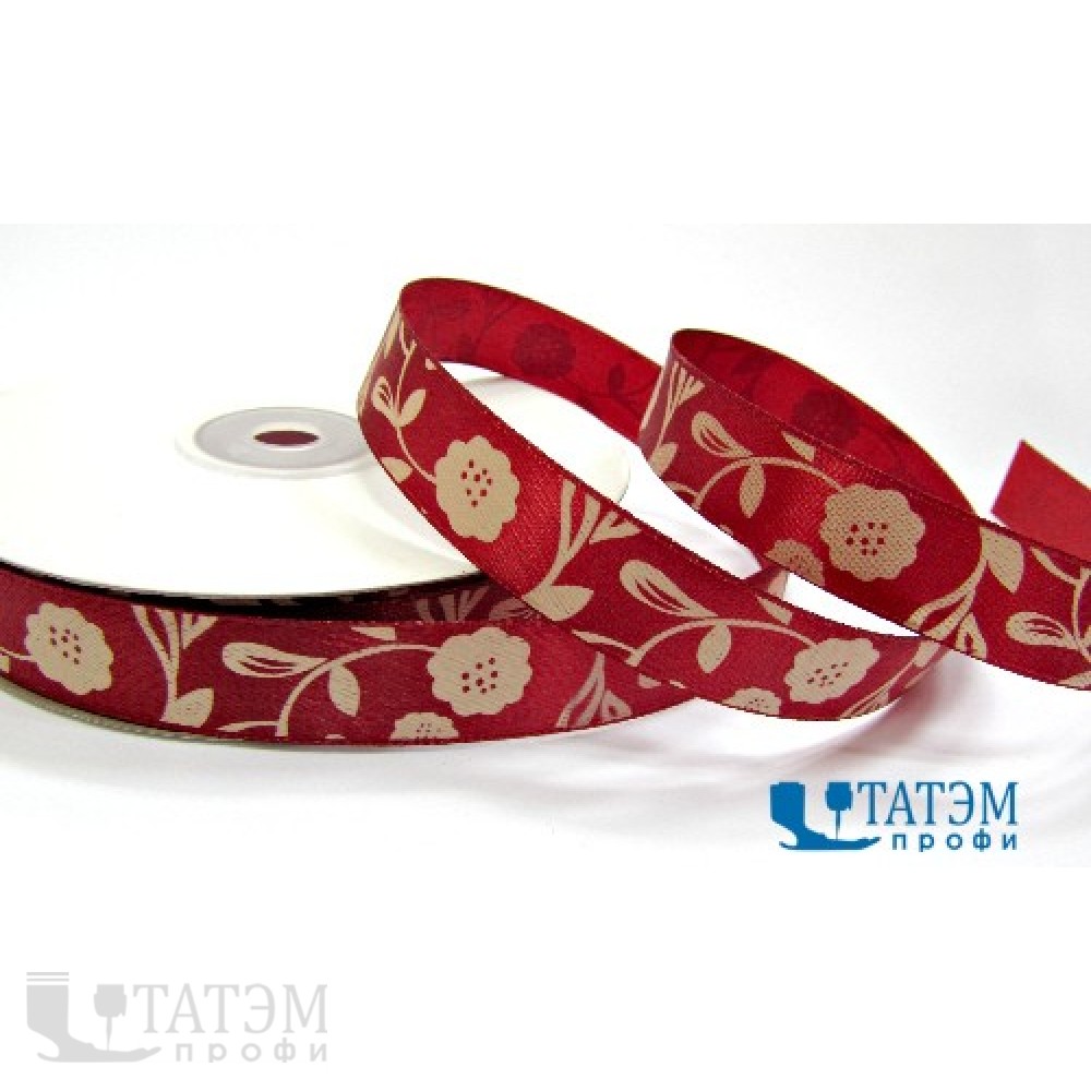 Лента декор. атласная с рис."цветы золотистые" 15 мм, бордовый, уп. 50 ярд