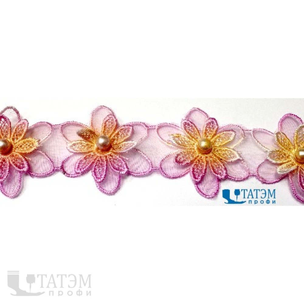Лента декор. гипюр "цветок объемный" 75 мм, розово-желтый, уп. 5 ярд