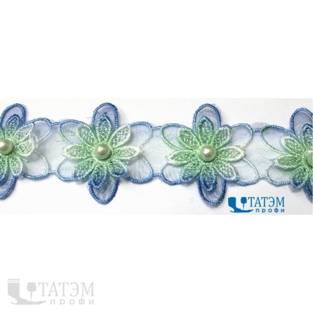Лента декор. гипюр "цветок объемный" 50 мм голубой-салатовый, уп. 5 ярд