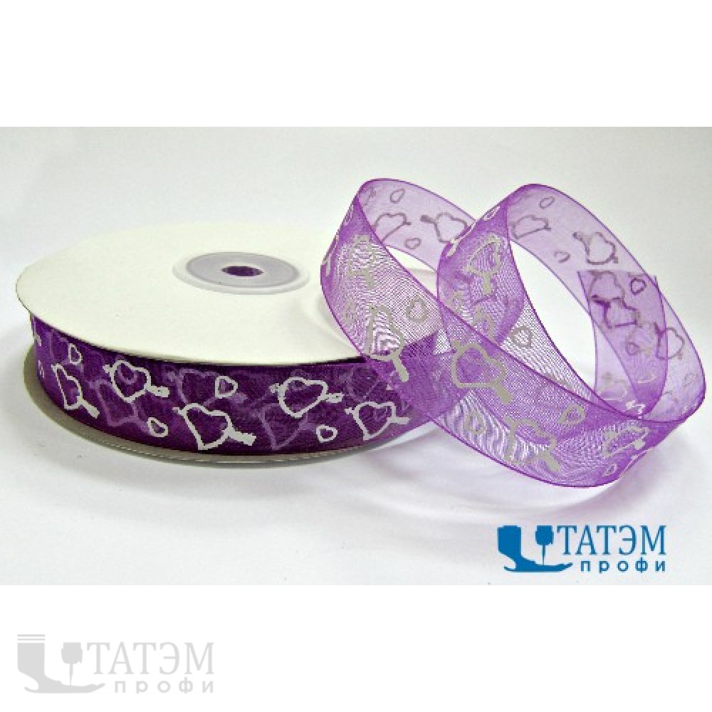 Лента декор. капроновая с рис."сердца" 20 мм фиолетовый/белый, уп. 50 ярд