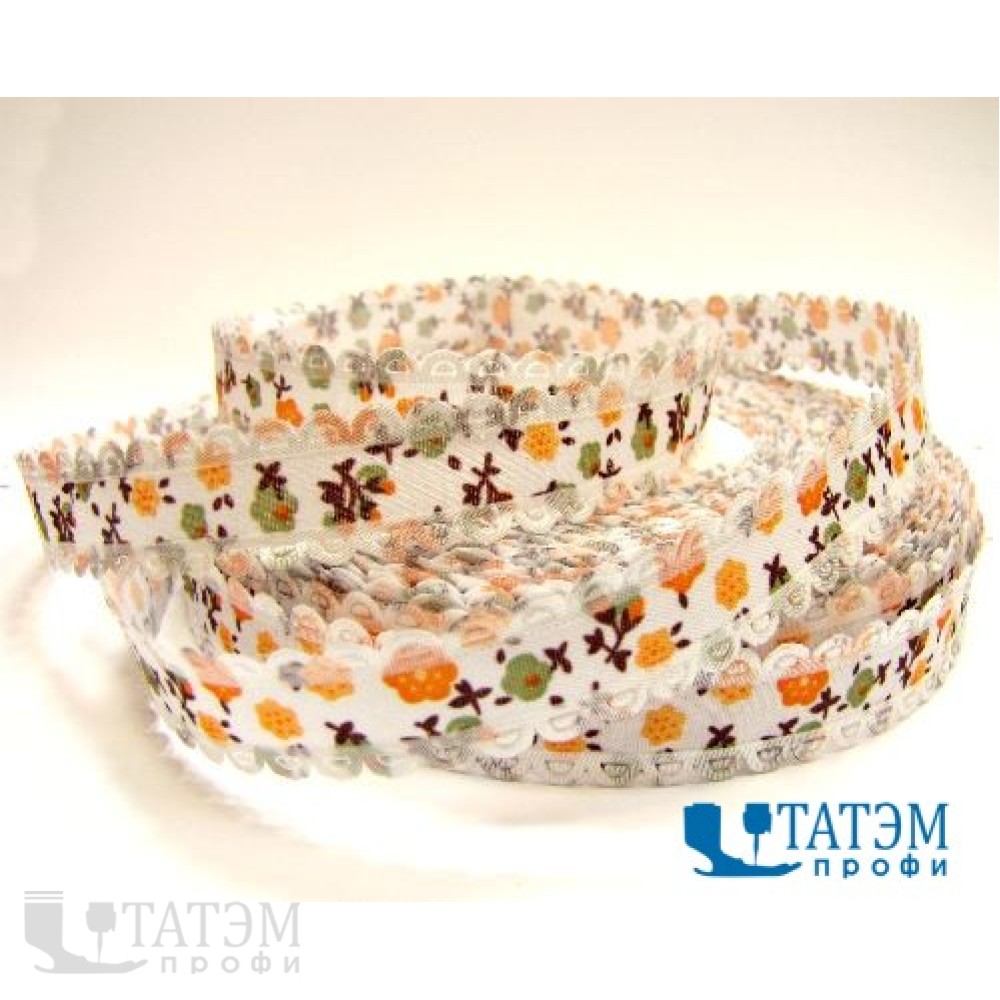 Лента декор. с ажур. краем "цветы" 18 мм, белый сирень/зелень, уп. 50 ярд