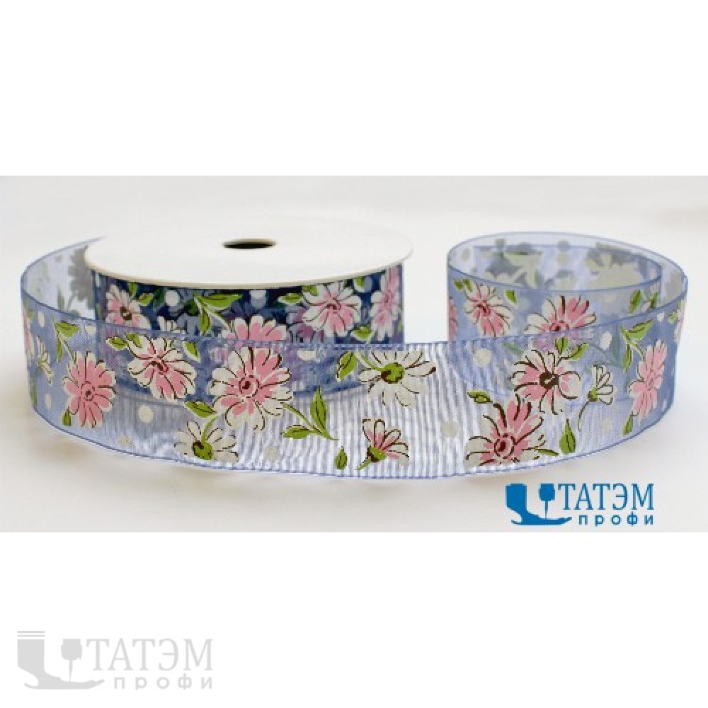 Лента декоративная "сатин с цветочным принтом" 38 мм серый, уп. 10 ярд