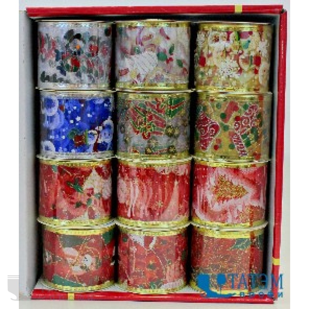 Лента декор подарочная, 63 мм, "Органза с цветным рисунком", ассорти, (уп. 12 рул по 3 ярда)