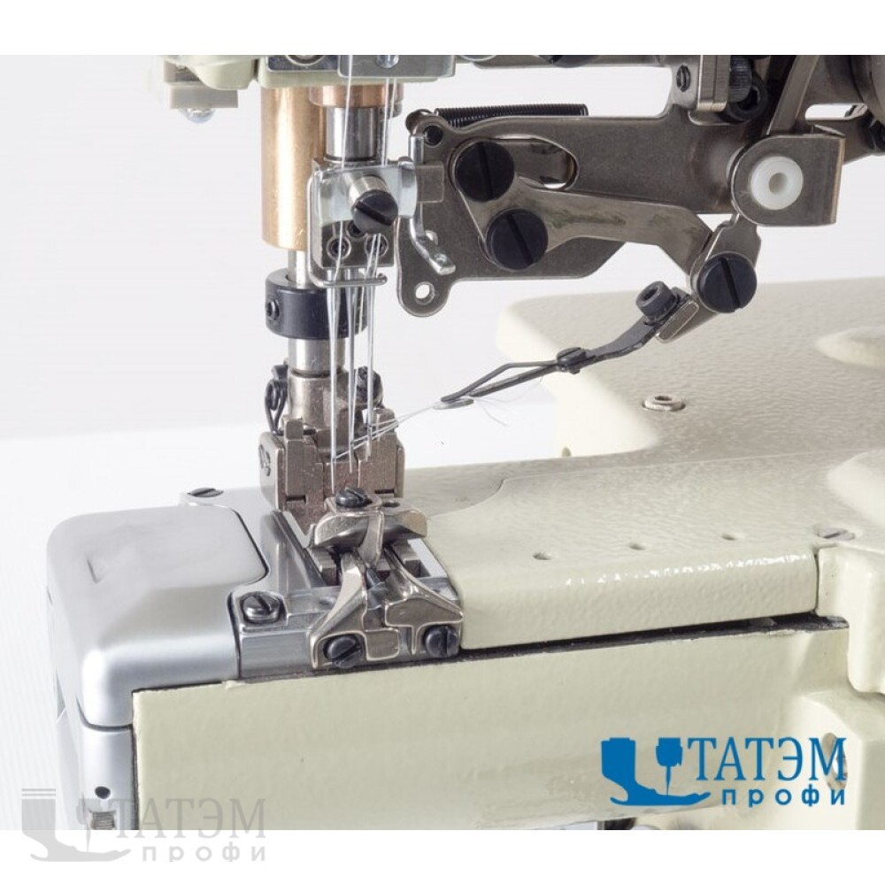 Трехигольная, пятиниточная машина с узкой цилиндрической платформой и автоматикой для вшивания и манжет, рукавов, подгибки рукавов, обработки перчаток, для легких и средних трикотажных тканей