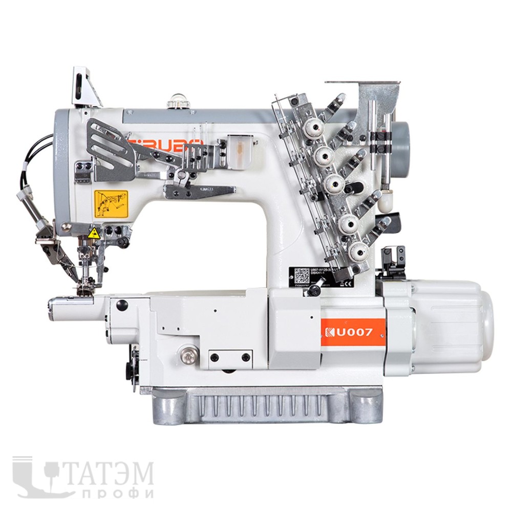 3-игольная 5-ниточная плоскошовная (распошивальная) машина цепного стежка с узкой цилиндрической платформой, встроенным серводвигателем с прямым приводом, верхним и нижним застилом, пневмоустройством обрезки нитей и подъема лапки.