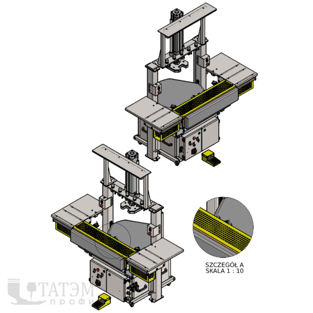 - Двуручная система безопасности: прижимная головка опускается только при одновременном нажатии двух кнопок.