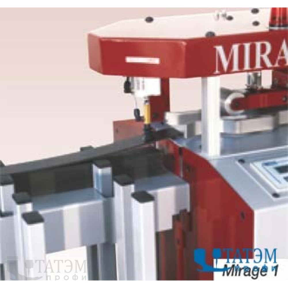 OMAC Mirage 1: Ремни берутся с вмонтированного хранилища (разделенного на две стопки) используя систему из фотоэлементов и присосок и помещаются в рабочий цикл обработки с помощью механизированного ведущего транспортного ролика.