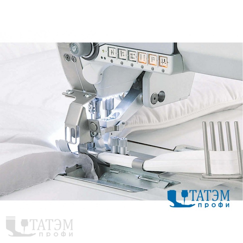 Одноигольная швейная машина двойного челночного стежка с интегрированным DA сервоприводом, тройным продвижением (нижнее реечное, игольное и чередующиеся шагающие лапки), подключаемым устройством обрезки кромки и шагающим окантователем, электромагнитным устройством обрезки нити, включаемым электропневматическим натяжением нити, встроенной 2-ой длиной стежка, электропневматической закрепкой шва и подъемом лапки, электропневматическим устройством быстрой регулировки подъема, челноком XXL, со встроенным светильником (светодиод), с большим вертикальным челноком (левосторонний) состоящим из двух частей, предохранительной муфтой, с автоматической адаптацией скорости. С индикатором контроля масла.