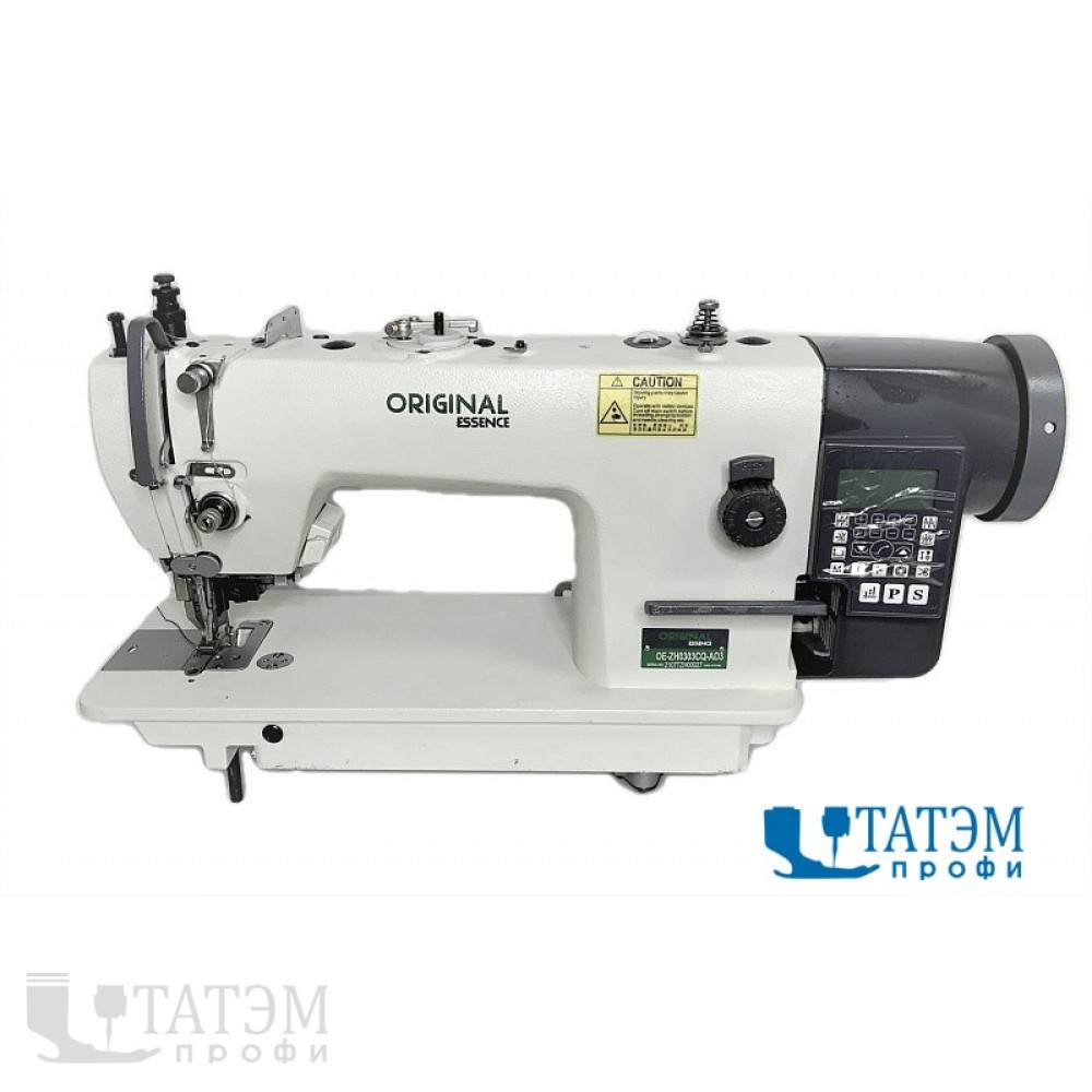 Одноигольная прямострочная швейная машина, с нижним, верхним продвижением, подрезкой края материала. ORIGINAL OE-ZH0303CQ-AD4 поставляется с автоматическими функциями: автоматической обрезкой нити, закрепкой, позиционированием; иглы и электромагнитным подъемом лапки.