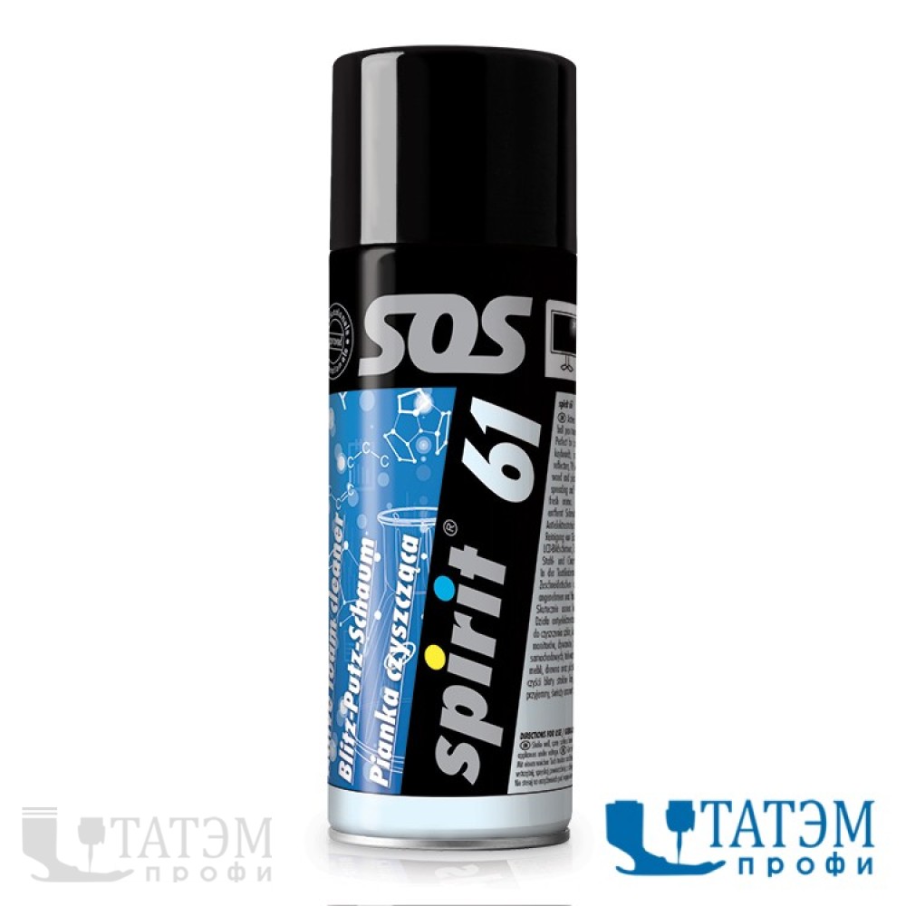 Spirit 61 - это активный пенообразный очиститель спрей. Удаляет загрязнения, жировые пятна, пыль. Антистатический. Не оставляет потеков. Прекрасно чистит рабочие поверхности закройных столов и швейных машин. Удаляет загрязнения с ковров, сидений автомобилей, сканеров, компьютеров, клавиатур, мониторов, мониторов ЖК, со стальных и хромированных поверхностей, мебели, дерева, пластика, стекла, хрусталя. Оставляет приятный, свежий запах.