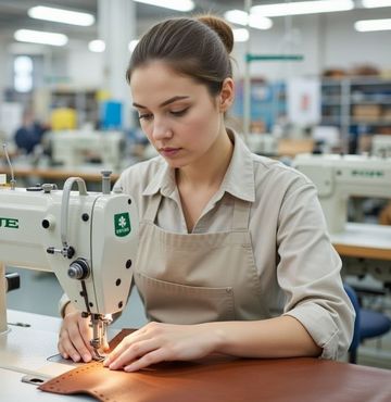 И вот наступает ключевой этап — сшивание деталей. В производстве кожгалантереи применяются промышленные швейные машины различных типов в зависимости от конструкции изделия. Для выполнения основных соединительных швов используются одноигольные и двухигольные прямострочные машины с усиленным приводом, способные прошивать плотные материалы и многослойные участки. Для обработки цилиндрических и труднодоступных элементов, таких как ручки и объемные детали сумок, применяются колонковые швейные машины. Рукавные машины удобны при работе с небольшими замкнутыми деталями, а плоскошовные и краеобметочные машины используются для обработки подкладки и внутренних элементов.