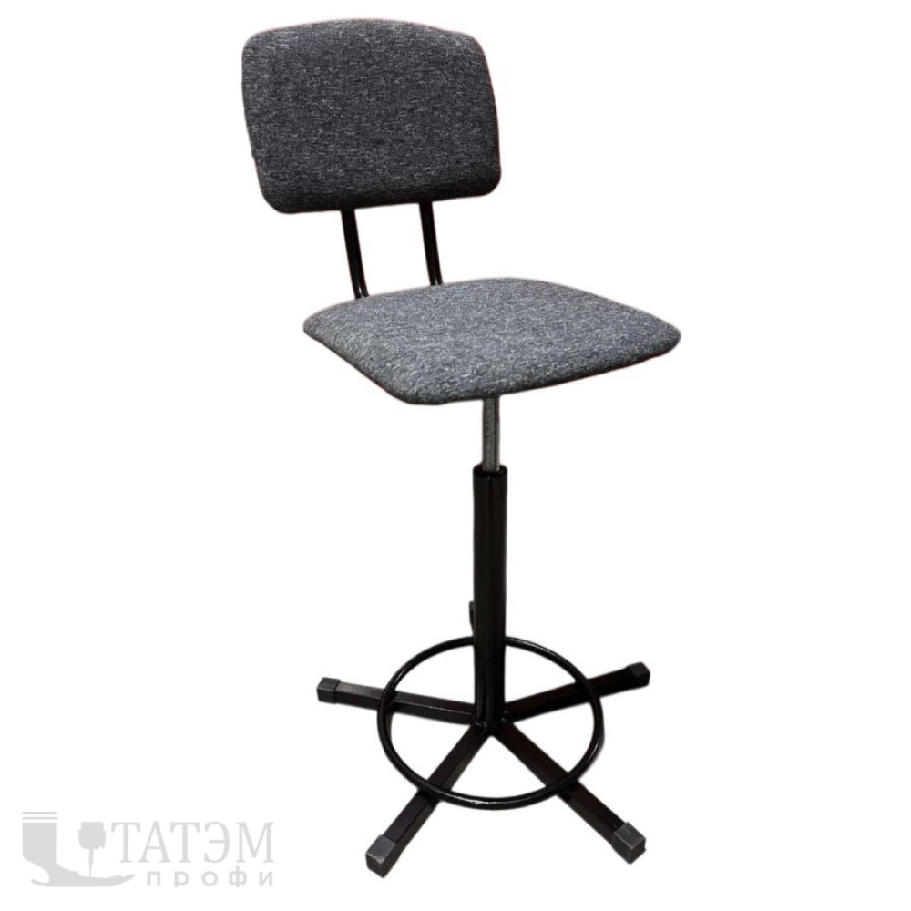 Стул винтовой промышленный с кольцом для швей, а также для предприятий, производство которых предусматривает длительное нахождение работника в сидячем положении. Стул имеет мягкое сиденье трапециевидной формы и спинку, которые покрыты чехлом из ткани или кожзама. Регулировка по высоте осуществляется с помощью надёжного винтового механизма. Прочный металлический каркас установлен на 4-х лучевую опору из металла, соединенных кольцом. Это все обеспечивает устойчивость и безопасность при эксплуатации, выдерживая нагрузку до 150 кг.